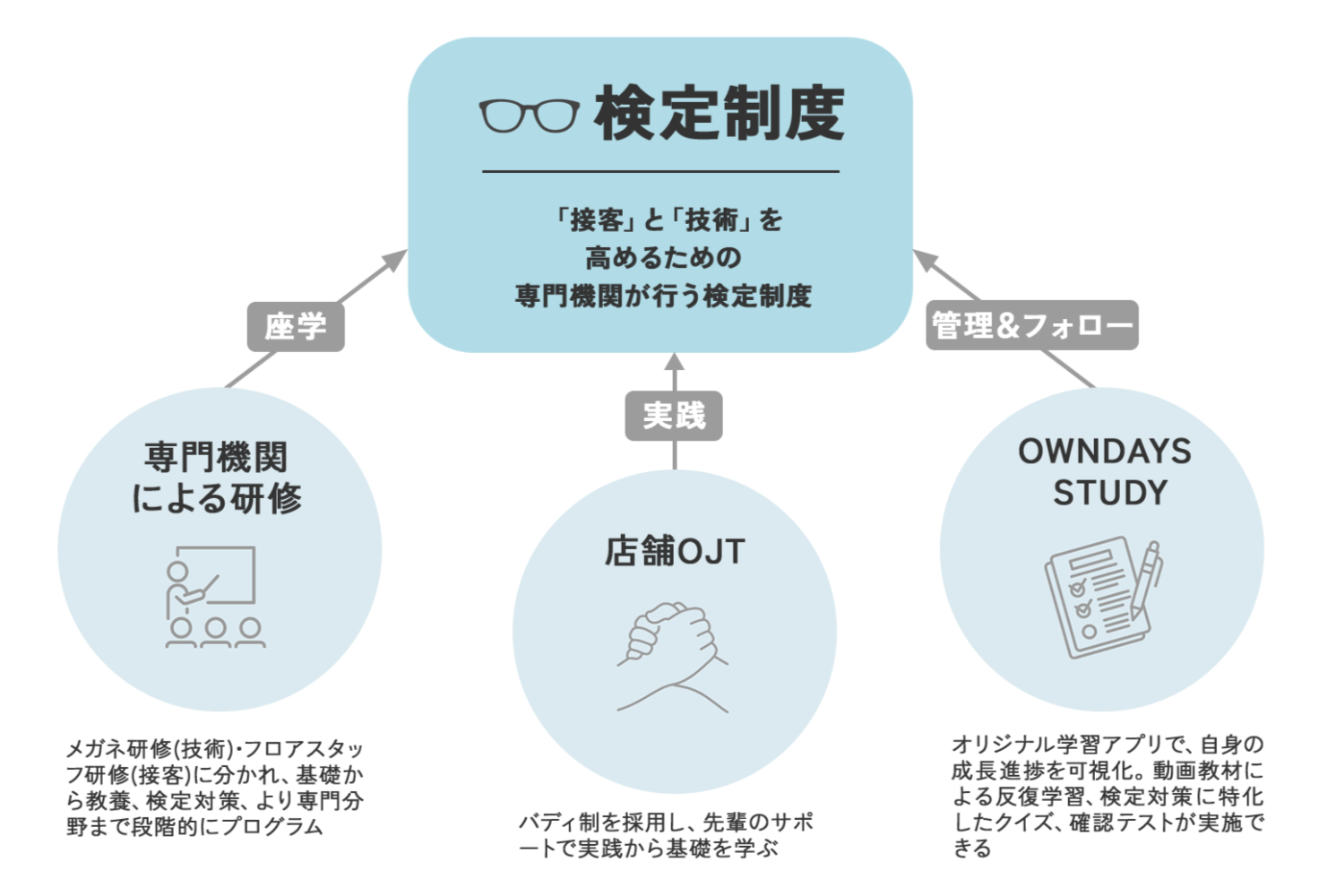 N.K.:メガネのことは、1回の講習だけで身につくことはないんですよね。座学で学んだ人が、明日から100点のサービスをお客様に提供できるわけではありません。何度も繰り返していくことで、習熟度が上がる業種です。技術取得に時間をかけるのも、店舗OJTを導入しているのも、お客様に満足していただくため。専門機関の講習を受講し、入社4か月までに「フロアスタッフ」に関する検定および「メガネ技術」に関する検定の4級を取得し、入社1年を目安にそれぞれ3級を取得することを必須としています。