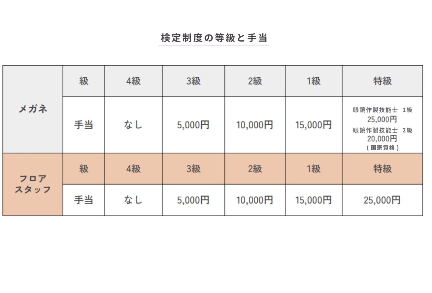 N.K.:検定の試験内容は、主に筆記と実技があり、合格した人には等級に応じて手当を支給しています。例えば、「メガネ技術」に関する検定2級※と「フロアスタッフ」に関する検定3級を持っている人なら、毎月15,000円がお給料にプラスされます。
