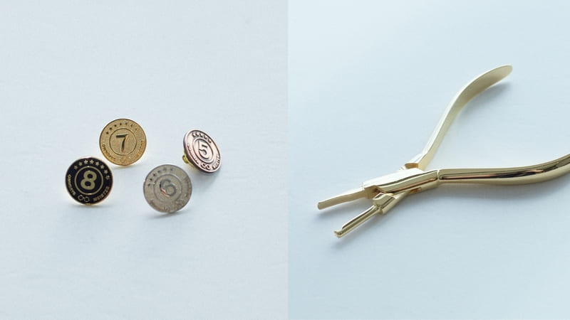左:2026年春以降に導入される、等級を表す社員用バッジ。全ての検定に合格した人には、名入りの特製バッジが与えられる。右:メガネの鼻あて部分など細かいパーツの調整に使われる道具「やっとこ」のオリジナル金バージョン