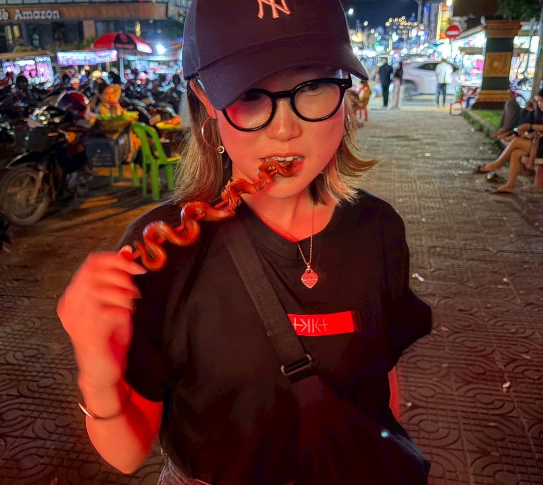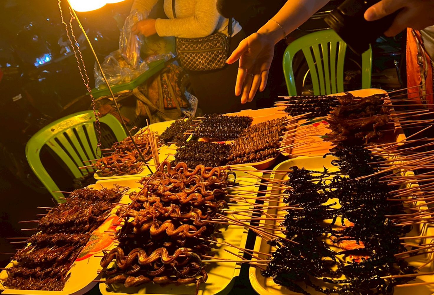 「せっかくカンボジアに来たんだから、虫食べるでしょ」と、東南アジアの屋台に慣れているメンバーに連れられ、全員で地元の屋台へ。ここで名物(?)の昆虫や爬虫類料理に挑戦することに。