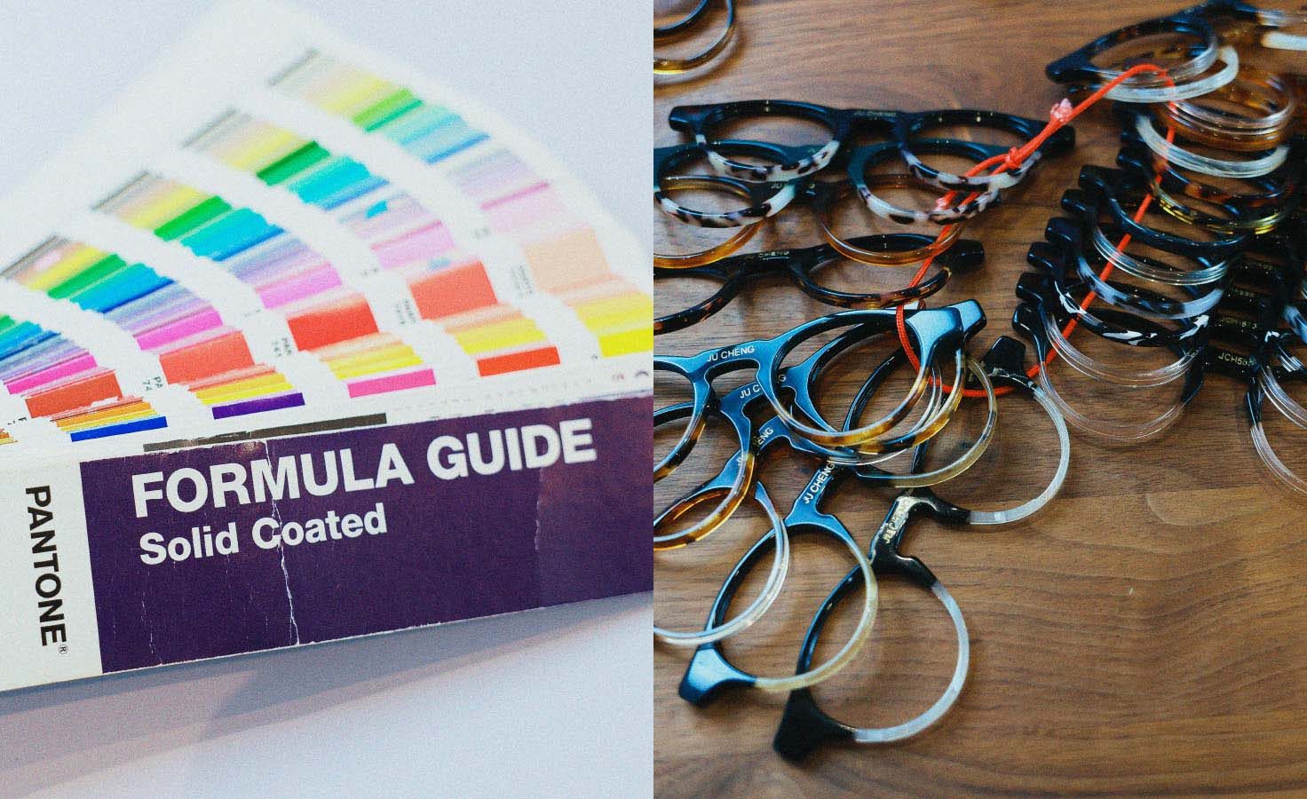 メガネフレームのデザインが決まったら、ターゲットやコンセプトに合わせて生地と呼ばれるフレームのプラスチック素材やカラーを検討していきます。素材はプラスチックの他にも金属(チタンや合金)、これらを合わせたコンビネーションもあり、組み合わせは無限大。